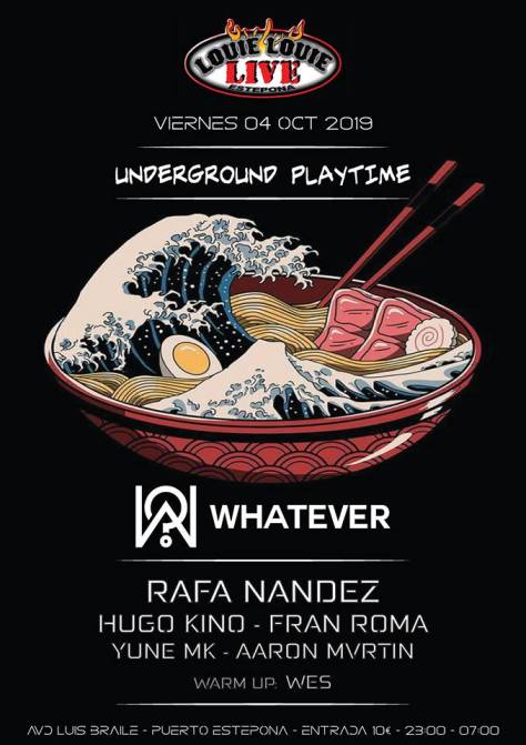 Primer evento Whatever de la temporada de invierno en el que se harán una serie de episodios con el nombre de UNDERGROUND PLAYTIME que tendrán lugar en la sala Louie Louie del puerto de Estepona. Concepto de cultura de club en el que se va a cuidar al detalle el sonido de calidad y el groove de alta intensidad y en el que se pondrá en valor la sonoridad de los subgraves para conseguir esa vibración única y en donde podremos disfrutar en cada evento a grandes artistas seleccionados cuidadosamente por su trabajo actual en la escena Techno… Para comenzar con mucha diversión y sacarte una gran sonrisa durante toda la noche (puesto que es el día mundial de la sonrisa) te traemos como cabeza de cartel a unos de los artistas más influyentes de la escena Techno malagueña, viene a vernos RAFA NANDEZ desde Greet Art (Malaga), artista que no necesita presentaciones por que el solito se ha cosechado un estilo propio muy particular y muy conseguido con sus enormes producciones…