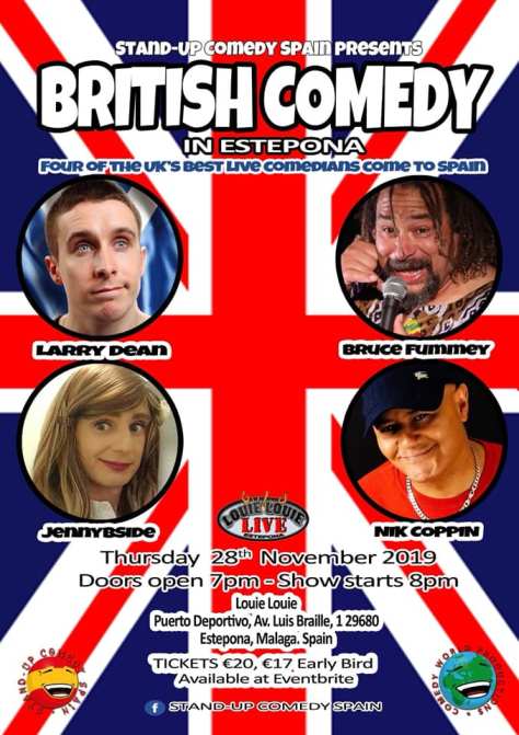Hilarious British comedians JennyBSide, Bruce Fummey and Larry Dean make their way to Spain to join regular MC Nik Coppin for a night of great live comedy at the vibrant Louie Louie venue in Estepona!