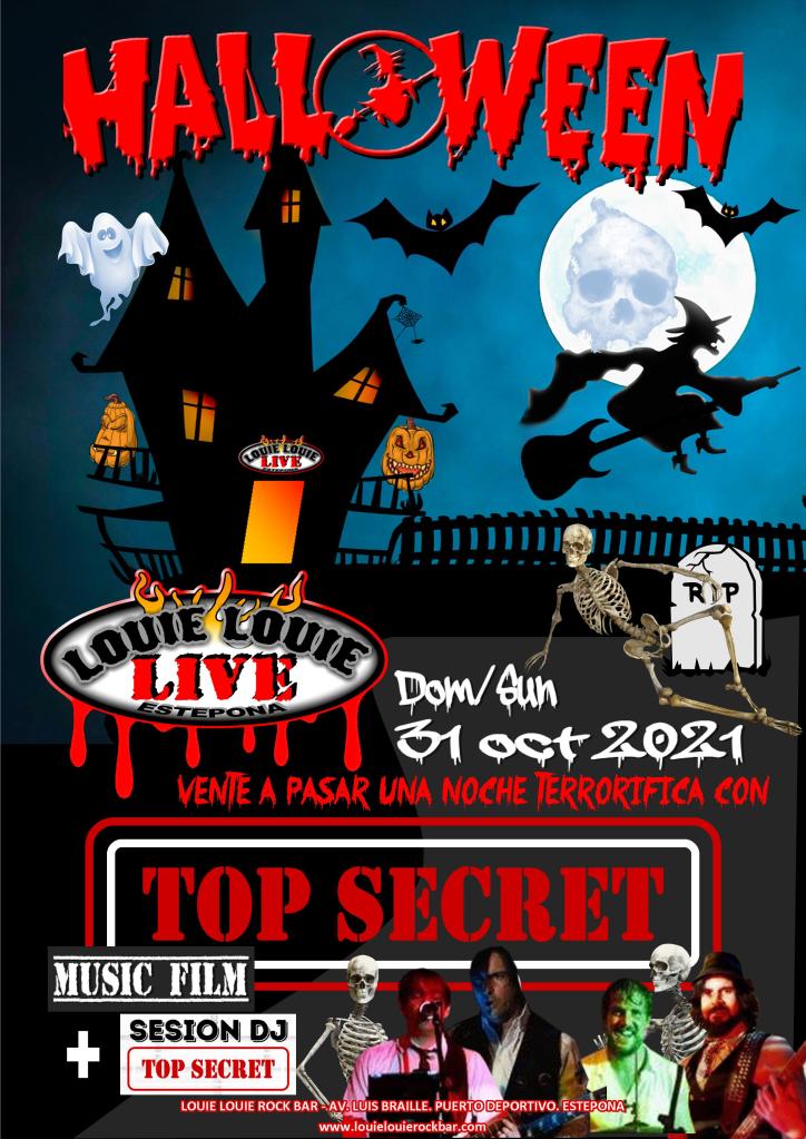 Terrorífica noche de Halloween en Louie Louie Live Estepona con TOP SECRET y sus música de películas y después Sesión DJ TOP SECRET. Una noche completa. Entrada gratuita