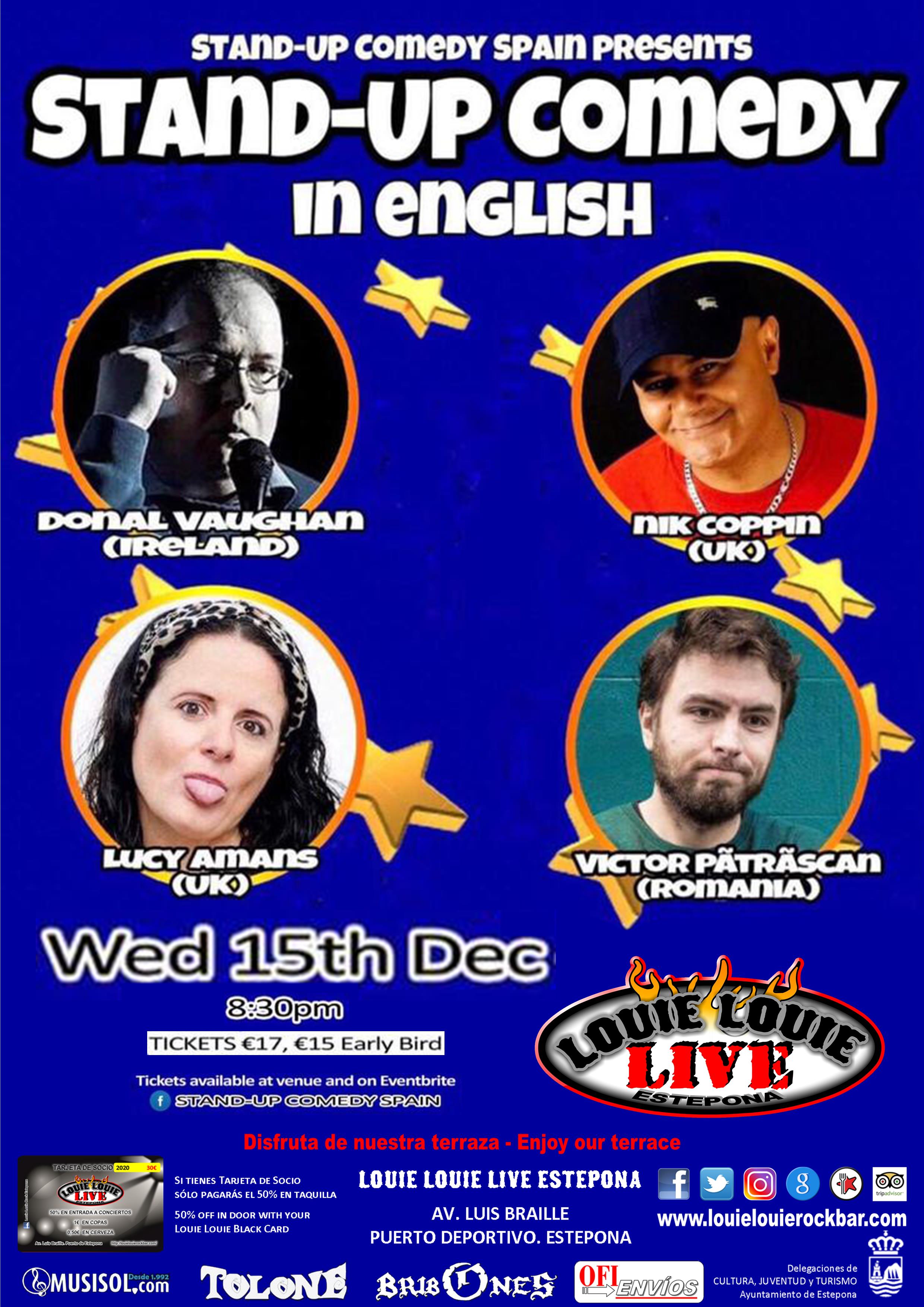 Varios comediantes de toda Europa vienen a Estepona para una divertida noche de monólogos. Entrada anticipada en Eventbrite 17€, en taquilla 15€