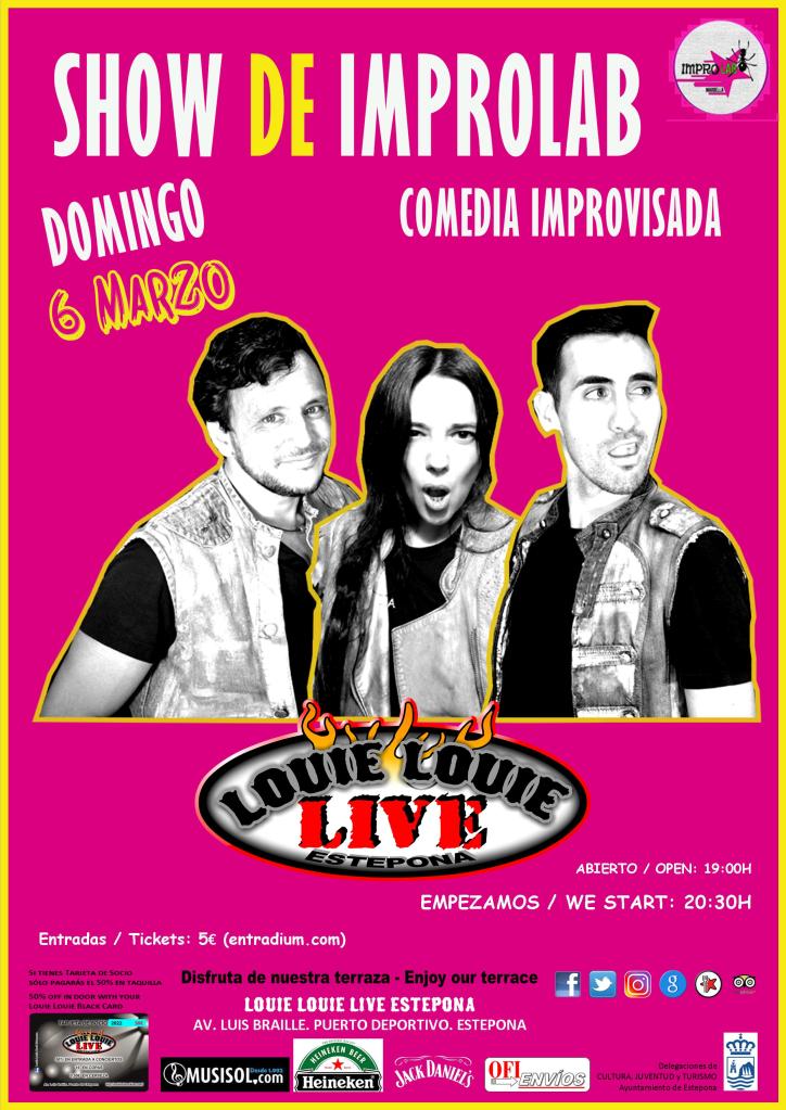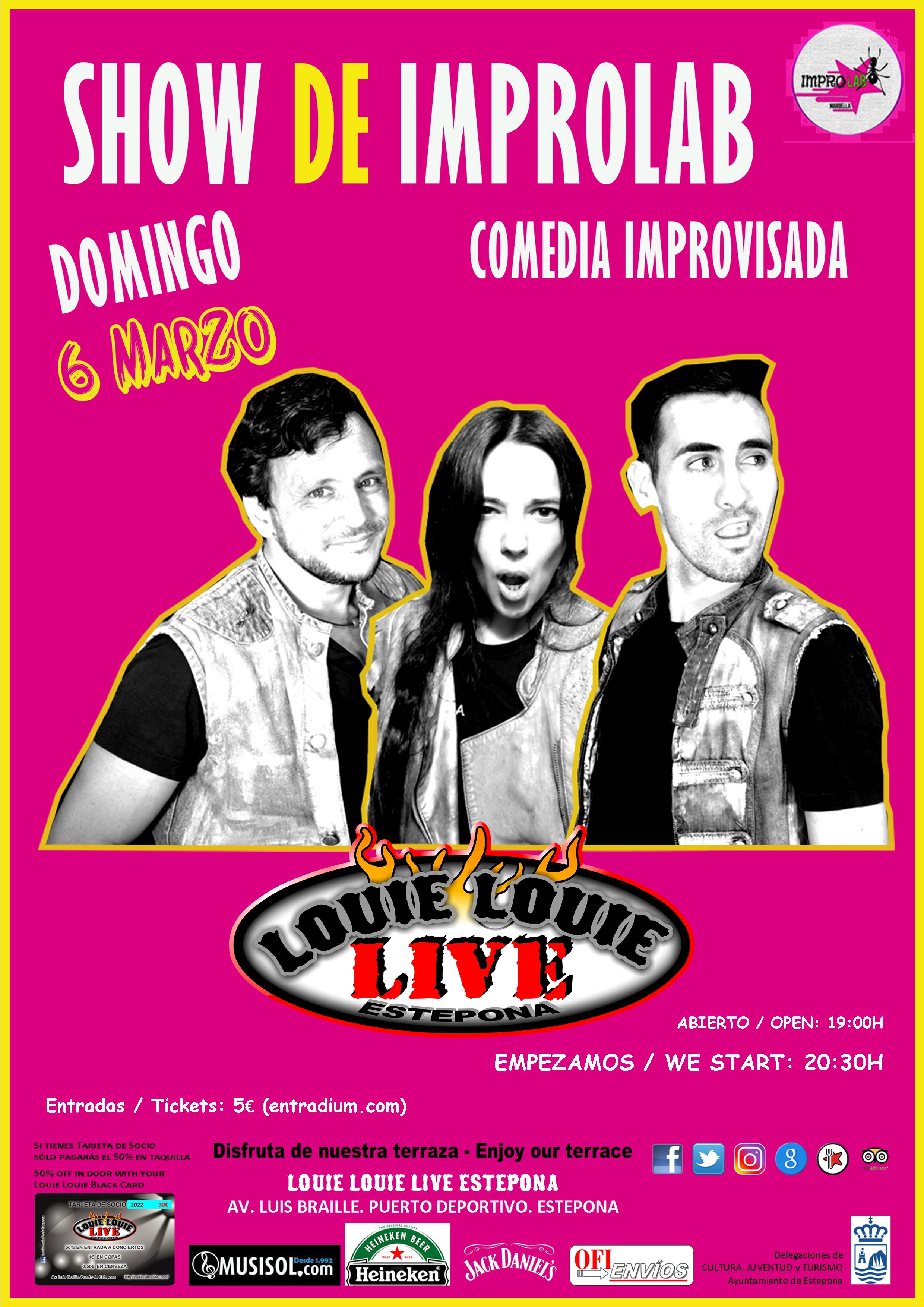 Sin categoría Show de Improlab. Comedia Improvisada 1 marzo, 2022 louielouierockestepona Domingo – 6 de Marzo de 2022 – Sunday Los chicos de Improlab vuelven a Louie Louie live a divertinos con su comedia improvisada. Entrada 5€ The guys from Improlab return to Louie Louie live to entertain us with their improvised comedy. Entry €5 PRÓXIMOS CONCIERTOS / UPCOMING GIGS Comparte esto: Compartir en X (Se abre en una ventana nueva) X Comparte en Facebook (Se abre en una ventana nueva) Facebook Haz clic en Pinterest (Se abre en una ventana nueva) Pinterest Compartir en WhatsApp (Se abre en una ventana nueva) WhatsApp Enviar un enlace a un amigo por correo electrónico (Se abre en una ventana nueva) Correo electrónico Me gusta Cargando...