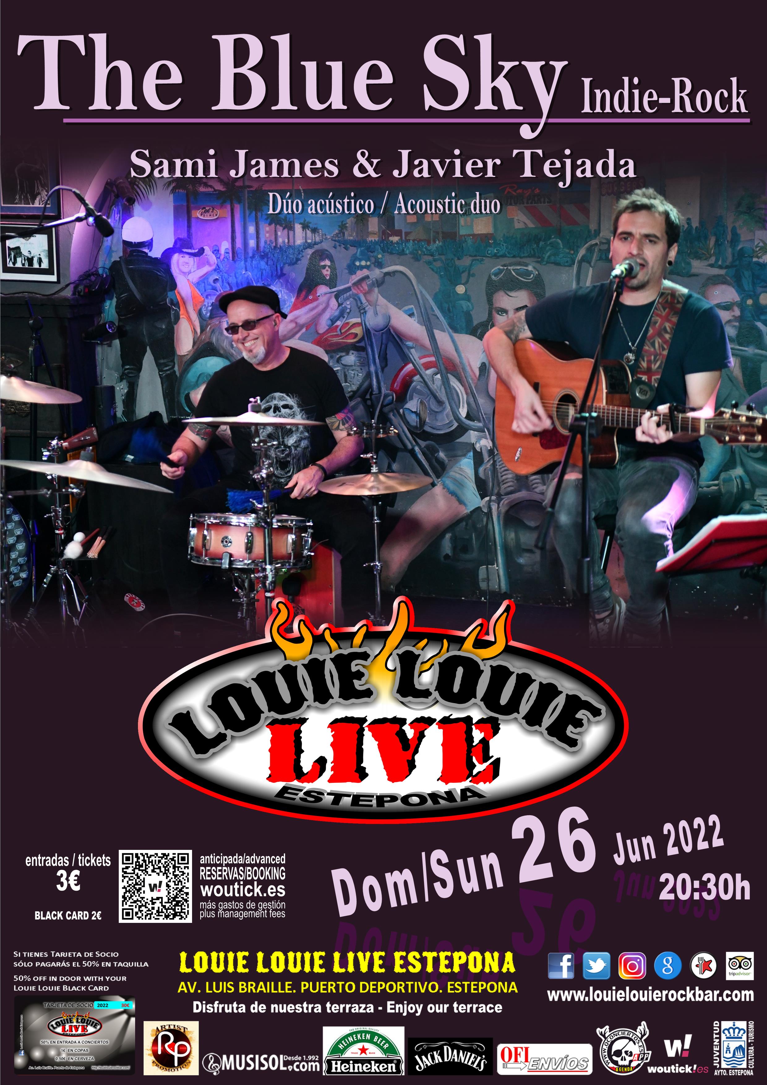 Bandas Españolas-Spanish Bands,Pop Rock The Blue Sky Indie-Rock 15 junio, 2022 louielouierockestepona Domingo – 26 de Junio de 2022 – Sunday Dúo acústico Indie-Rock con Sami James y Javier Tejada.Entrada 3€ Indie-Rock acoustic duo with Sami James and Javier Tejada.Entry €3 woutick.es Comparte esto: Haz clic para compartir en X (Se abre en una ventana nueva) X Haz clic para compartir en Facebook (Se abre en una ventana nueva) Facebook Haz clic para compartir en Pinterest (Se abre en una ventana nueva) Pinterest Haz clic para compartir en WhatsApp (Se abre en una ventana nueva) WhatsApp Haz clic para enviar un enlace por correo electrónico a un amigo (Se abre en una ventana nueva) Correo electrónico Me gusta Cargando...