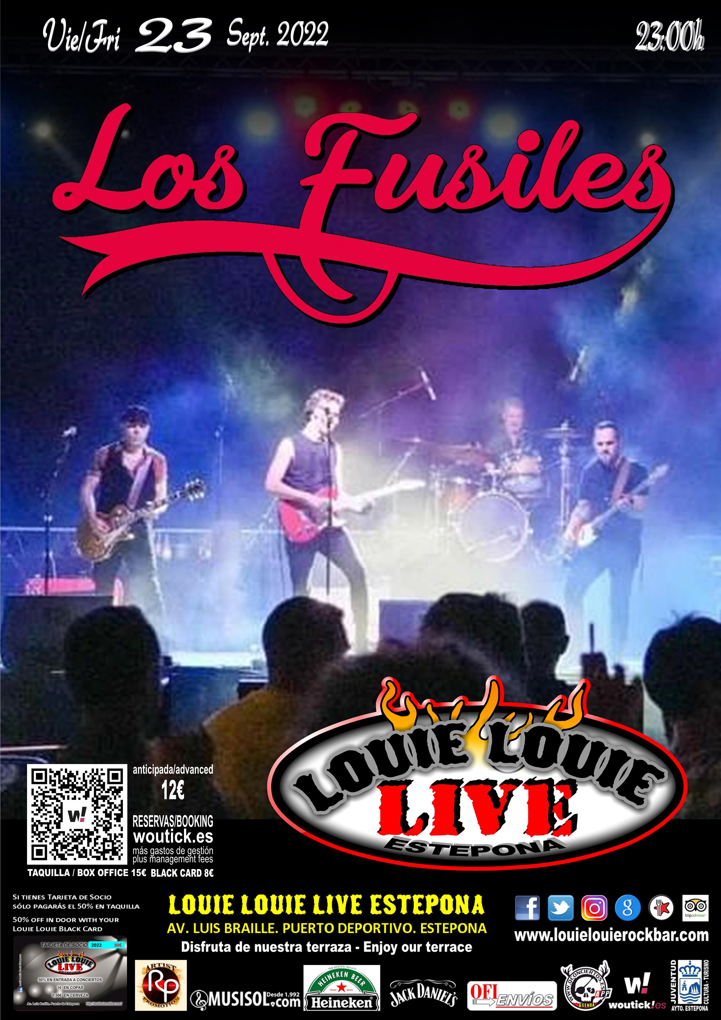 Bandas Españolas-Spanish Bands,Conciertos-Gigs,Fiestas-Parties,Pop Rock,Rock Bands Vie / Fri 23 Sep 2022 – LOS FUSILES 14 septiembre, 2022 louielouierockestepona Pop-Rock del bueno desde Sevilla.Entrada anticipada 12€ en woutick.es. En taquilla 15€, con Black Card 8€ Good Pop-Rock from Seville.Advance ticket €12 at woutick.es. At the box office €15, with Black Card €8 woutick.es Comparte esto: Haz clic para compartir en X (Se abre en una ventana nueva) X Haz clic para compartir en Facebook (Se abre en una ventana nueva) Facebook Haz clic para compartir en Pinterest (Se abre en una ventana nueva) Pinterest Haz clic para compartir en WhatsApp (Se abre en una ventana nueva) WhatsApp Haz clic para enviar un enlace por correo electrónico a un amigo (Se abre en una ventana nueva) Correo electrónico Me gusta Cargando...