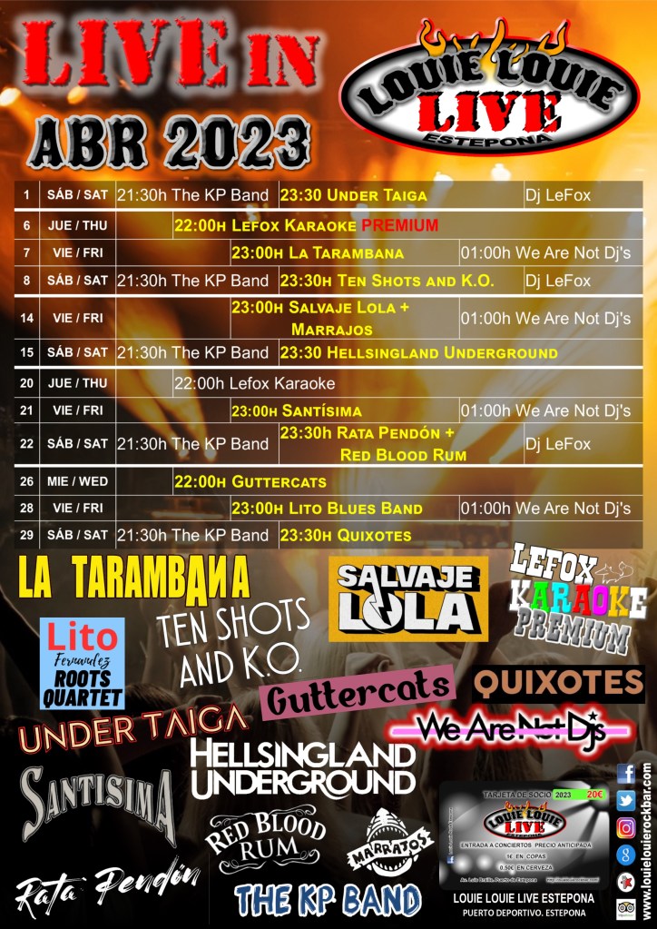 And this is our calendar for the month of March. Great tributes, local bands, Techno, international bands… Our KP Band is back and we’re starting every Thursday the «Jueves Party» with our DJ Sandro Banzai! djing the best music of all time on the Louie stage. And, of course, on Sundays the Jam-On where you can come and show us your rock skills with your instrument and your friends. Fun and good music guaranteed.