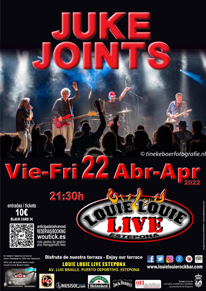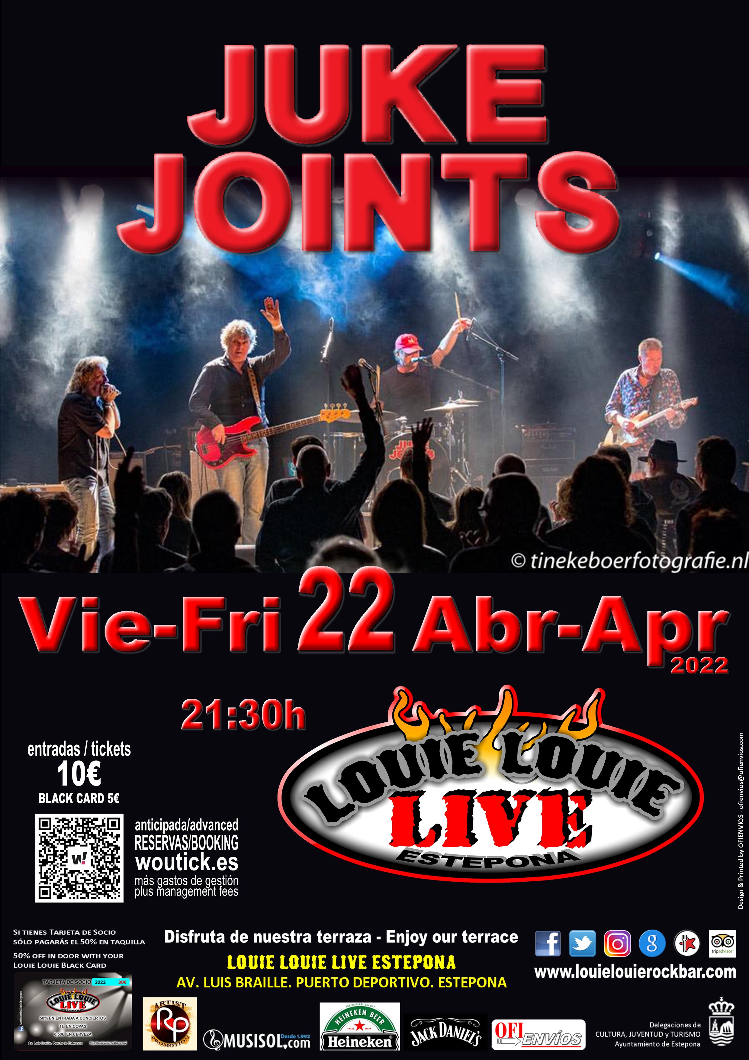 Grupo holandés de blues-rock, ganadores del Premio de la Dutch Blues Foundation en 2012 y 2016 a la «Mejor banda de blues holandesa». The Juke Joints han incendiado los escenarios internacionales durante no menos de 37 años y ahora nos visitan en Estepona. ¡No te lo pierdas! Entradas 10€, con Black Card 5€