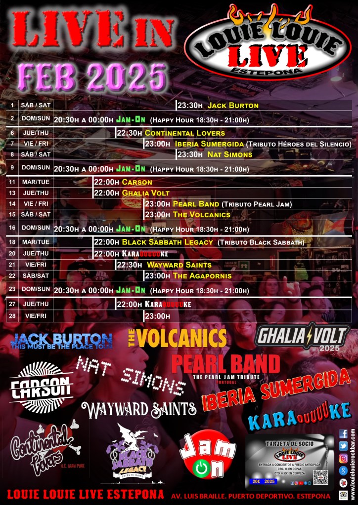 Apenas caben todos los eventos. Este mes tenemos tributos a grandes bandas interpretadas por grandes bandas. Bandas de Estados Unidos, Portugal y casi toda España también vienen a presentar sus nuevos trabajos. Ya estamos en temporada de giras, y tocar en Louie Louie Live es imprescindible.