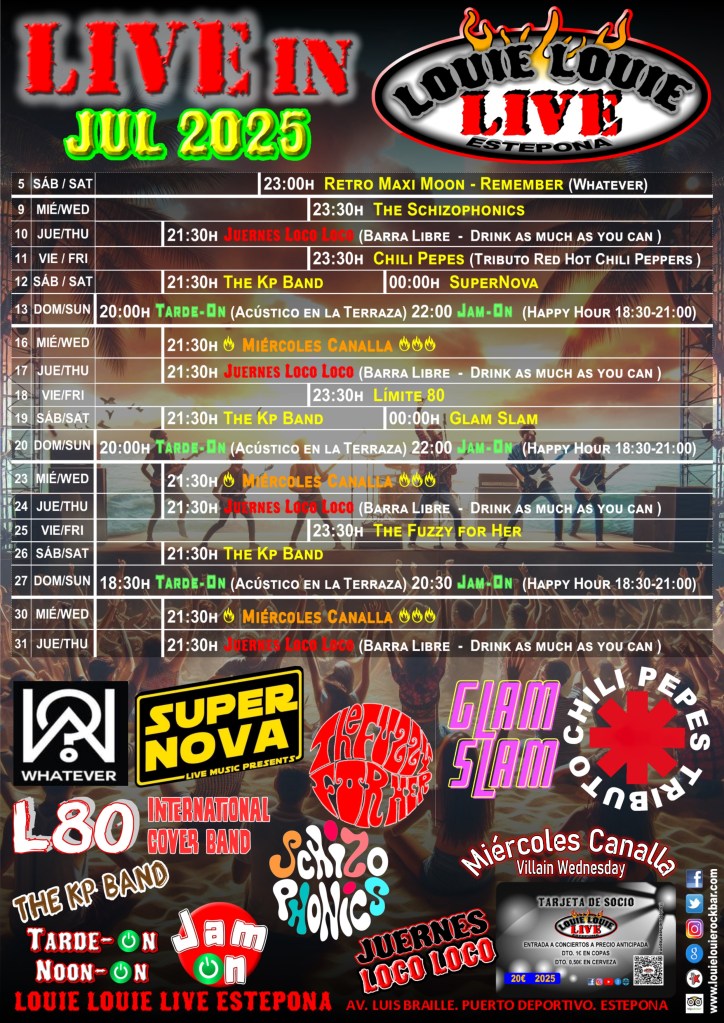 No dejes de venir a pasar la tarde del domingo en la terraza del Louie, con música en vivo en acústico. O a jugártela con las «canalladas» de los miércoles o a tomarte todas las copas que quieras el Juernes Loco Loco. Aquí estaremos, como siempre con una sonrisa y mucho Rock and Roll