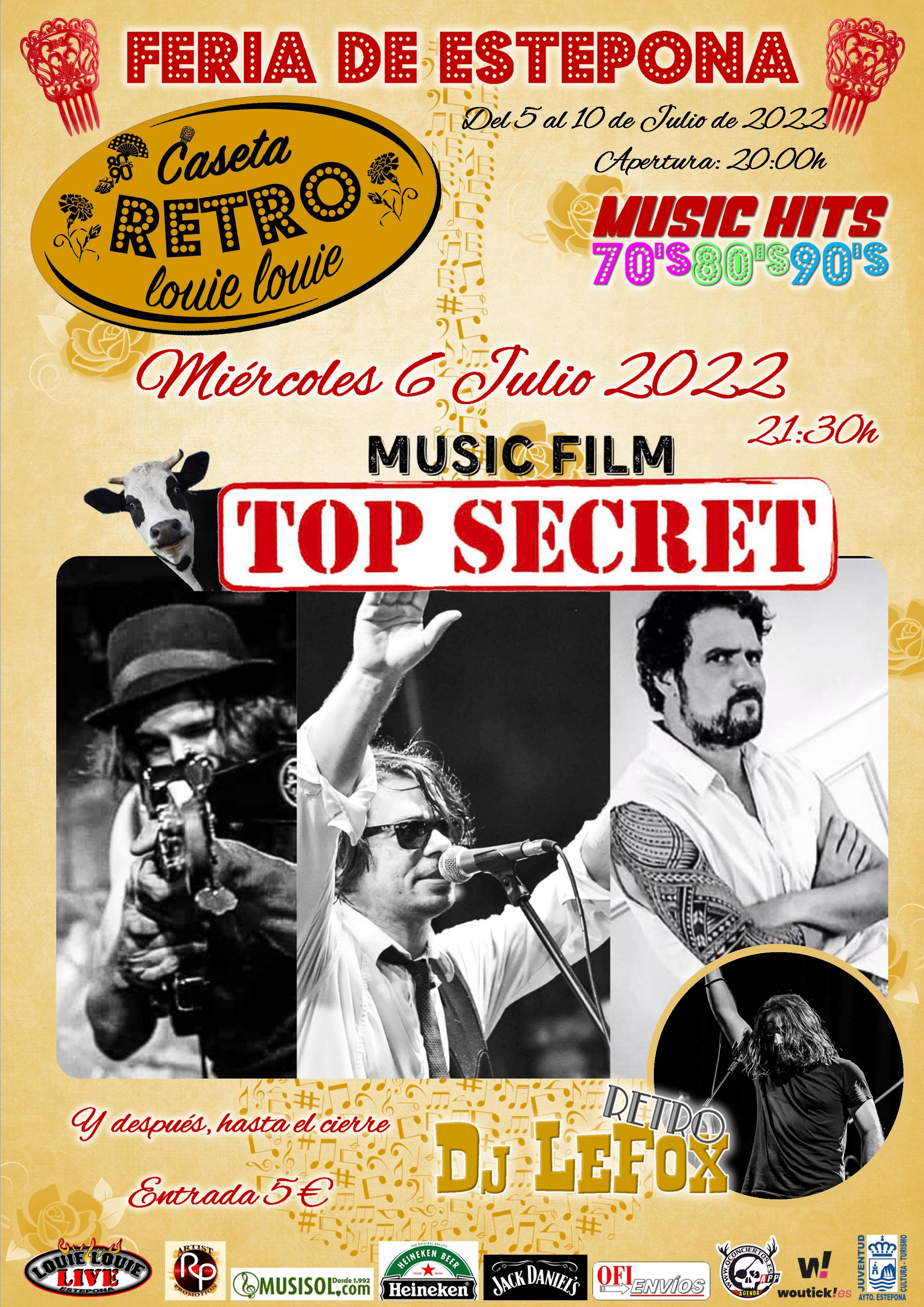 Los chicos de Top Secret vienen a la Caseta Retro Louie Louie en el Recinto Ferial de Estepona con sus versiones de Bandas Sonoras y después, hasta la madrugada, Dj LeFox Retro