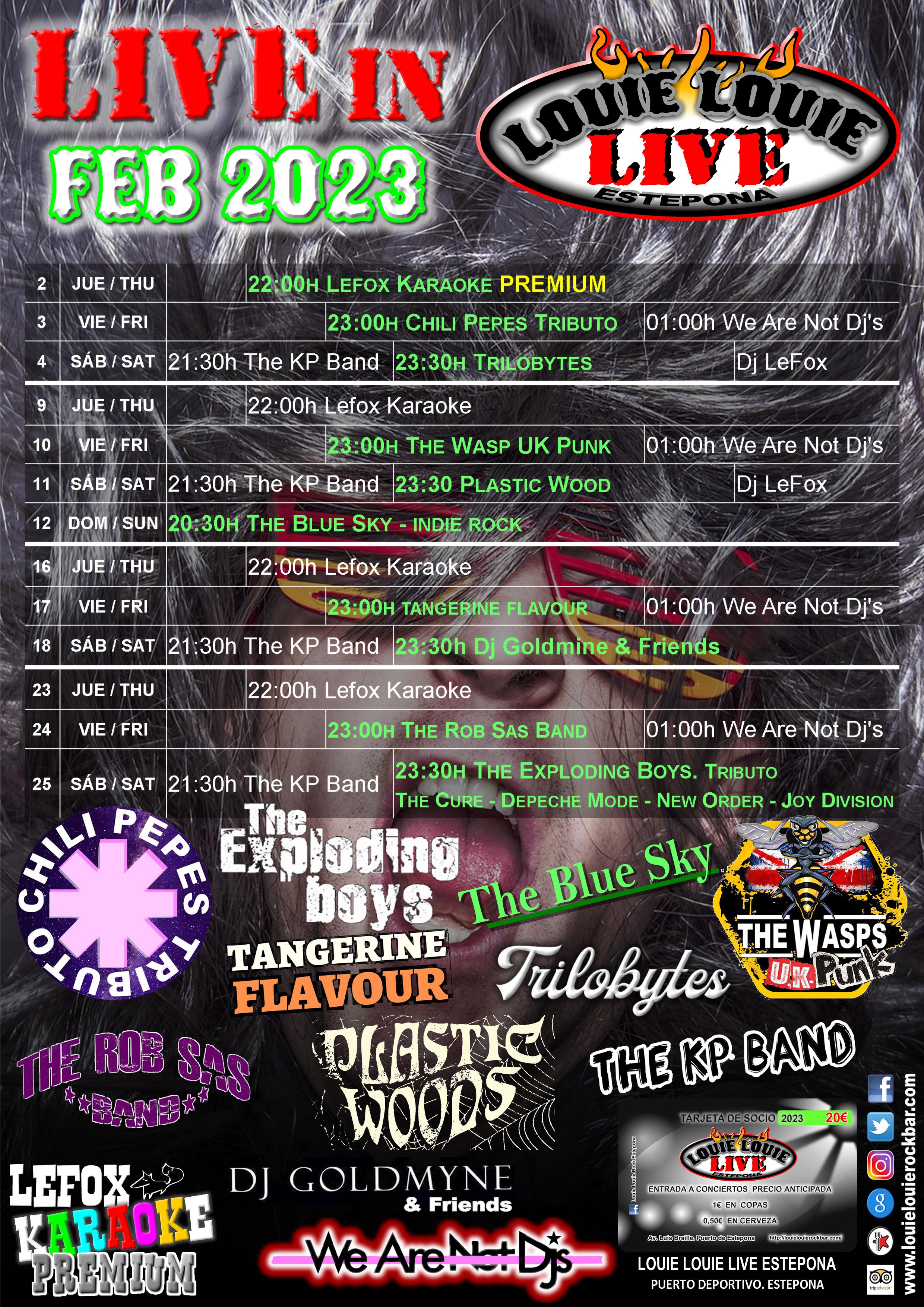 The month of February brings us to Louie Louie Live Estepona a lot of good Rock, Dj’s, Tributes…… In addition, this month we premiere our Le Fox Karaoke PREMIUM where we will raffle gifts, t-shirts, drinks, beers, Black Cards and a voucher €50 in drinks