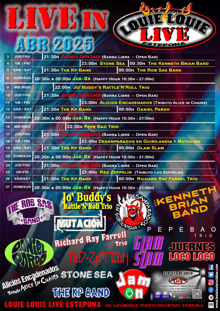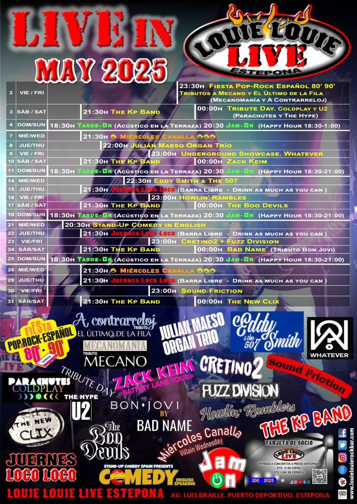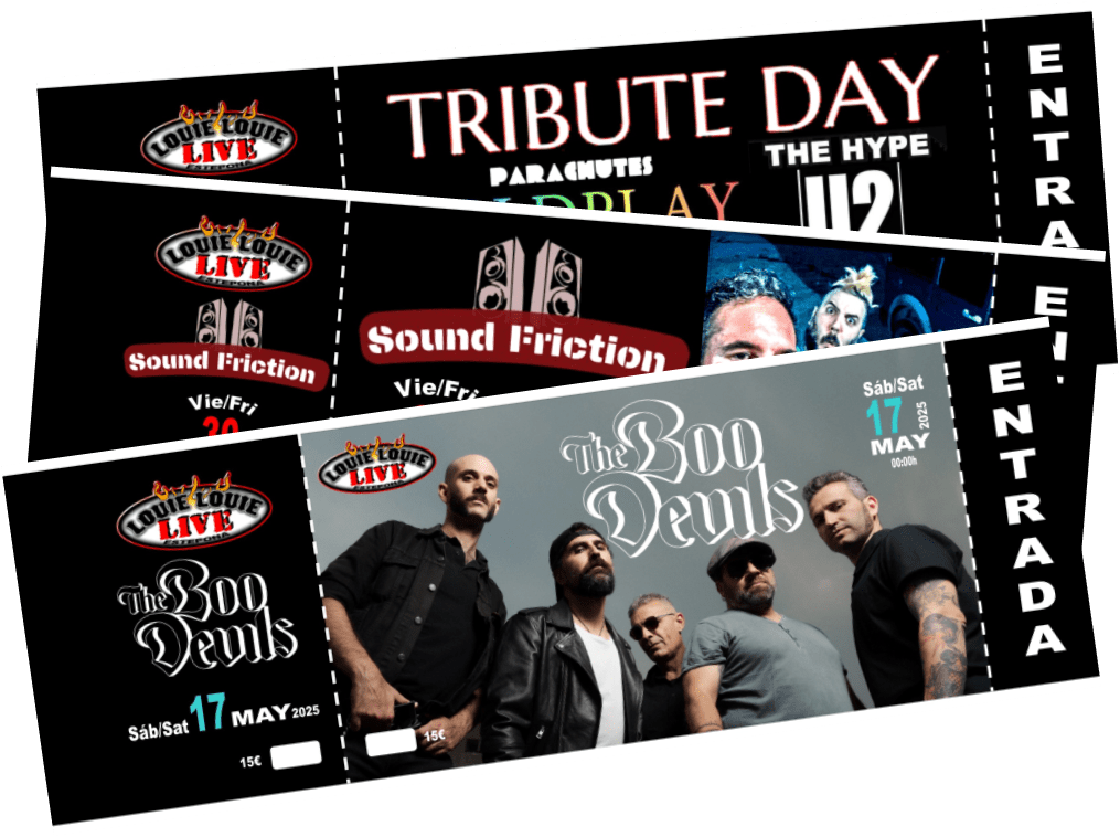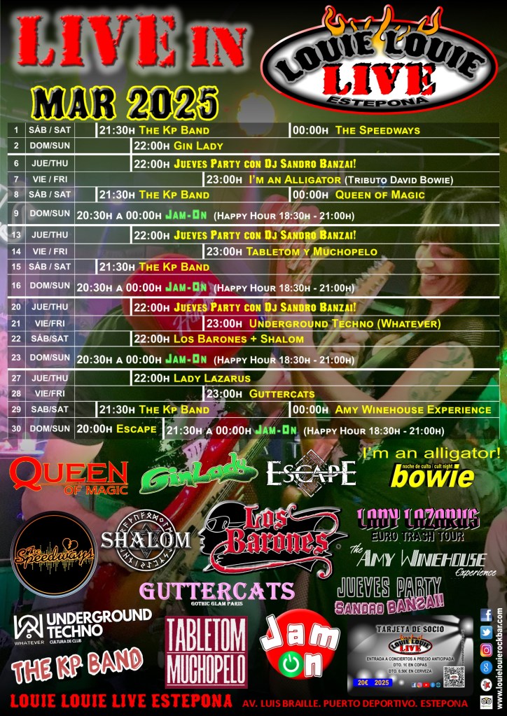 Apenas caben todos los eventos. Este mes tenemos tributos a grandes bandas interpretadas por grandes bandas. Bandas de Estados Unidos, Portugal y casi toda España también vienen a presentar sus nuevos trabajos. Ya estamos en temporada de giras, y tocar en Louie Louie Live es imprescindible.