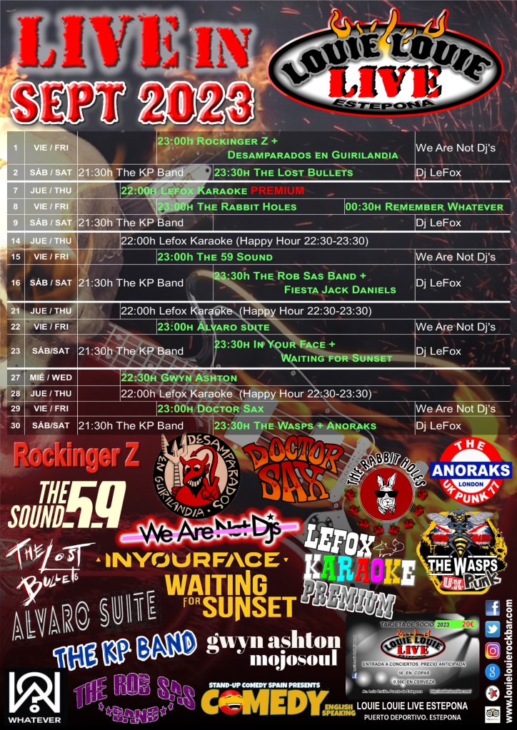 Aquí tenéis la programación para el mes de septiembre en Louie Louie Live Estepona.