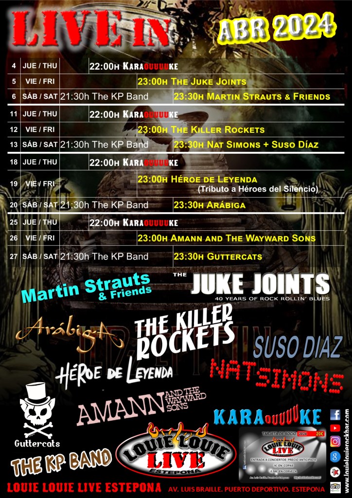 Entramos en la primavera con un calendario muy rockero. Aquí tenéis el resumen de este mes que incluye nuestro nuevo Karaouuuke donde puedes montar tu propio concierto, con tu instrumento, tu voz o lo que quieras. Y, por supuesto, The KP Band todos los sábados a partir de las 21:30h. ¡El equipo de Louie Louie Live Estepona os espera con una gran sonrisa!