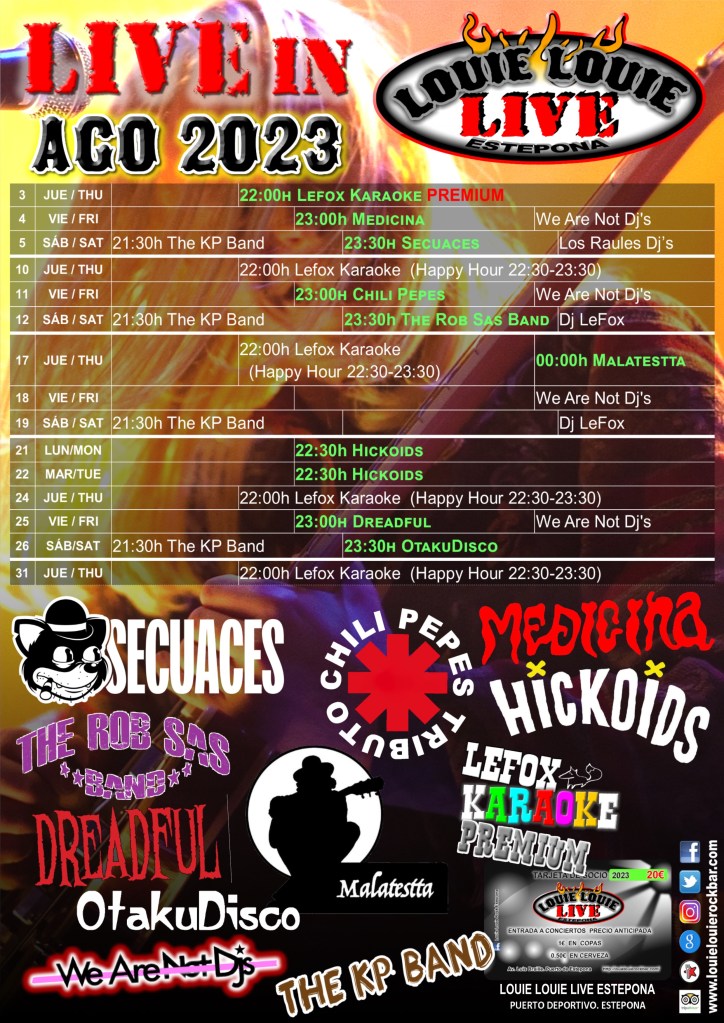 Aquí tenéis la programación para el mes de agosto en Louie Louie Live Estepona.