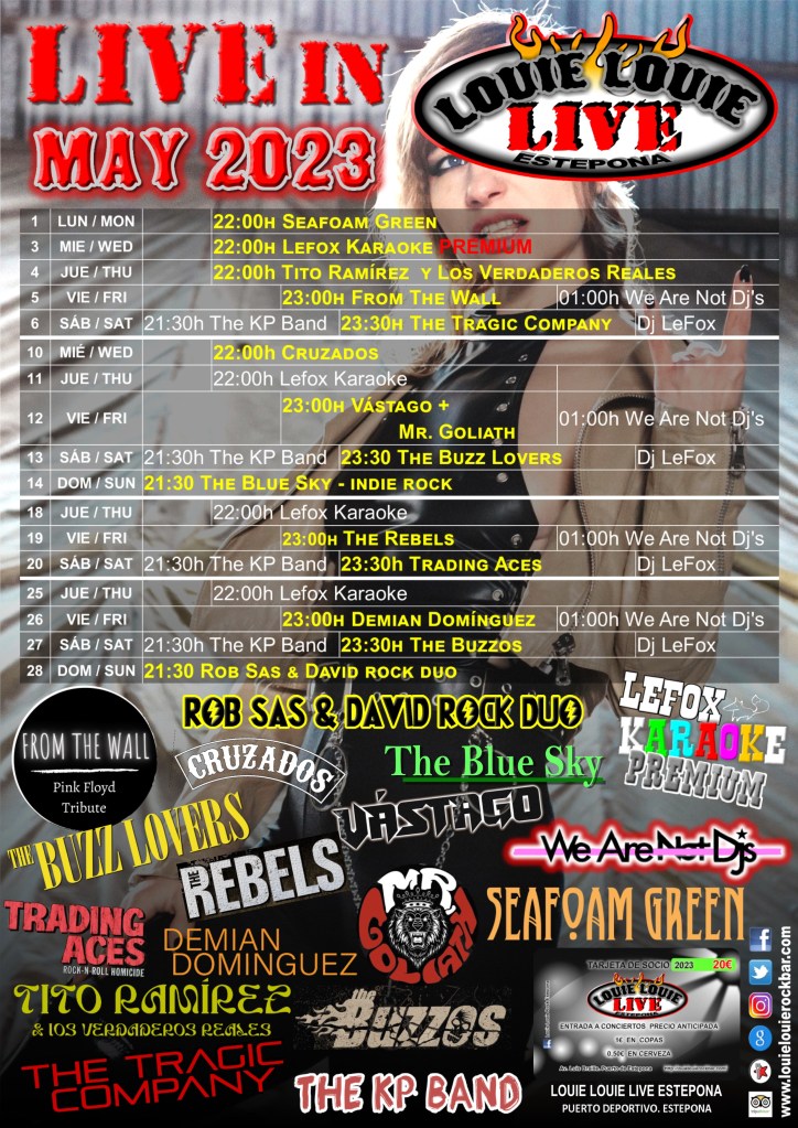 15 directos de 15 grandes grupos nacionales e internacionales además de nuestros habituales KP Band, todos los sábados a las 21:30, Le Fox con su Karaoke los jueves y pinchando los sábados después del concierto y We Are Not Dj’s con su magnífico espectáculo todos los viernes después de la media noche. ¡Va a ser un mes de Mayo espectacular! ¡Te esperamos en Louie Louie Live Estepona!
